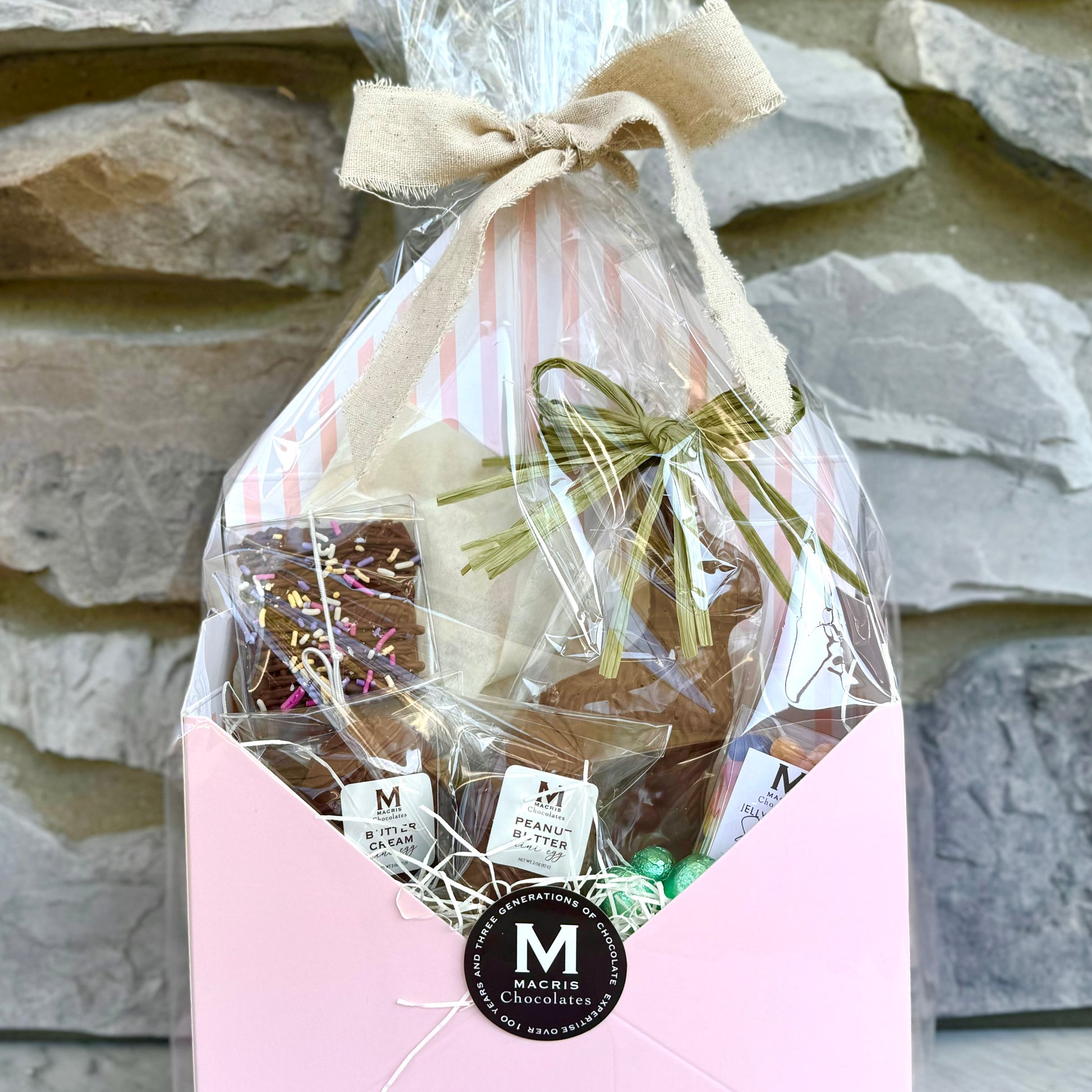 Enjoy this sweet collection of an Easter Basket with our solid milk chocolate rabbit, a pack of two milk chocolate decorated graham crackers, two of your choice of miniature eggs, spring jelly beans and festive foiled eggs sprinkled throughout.
