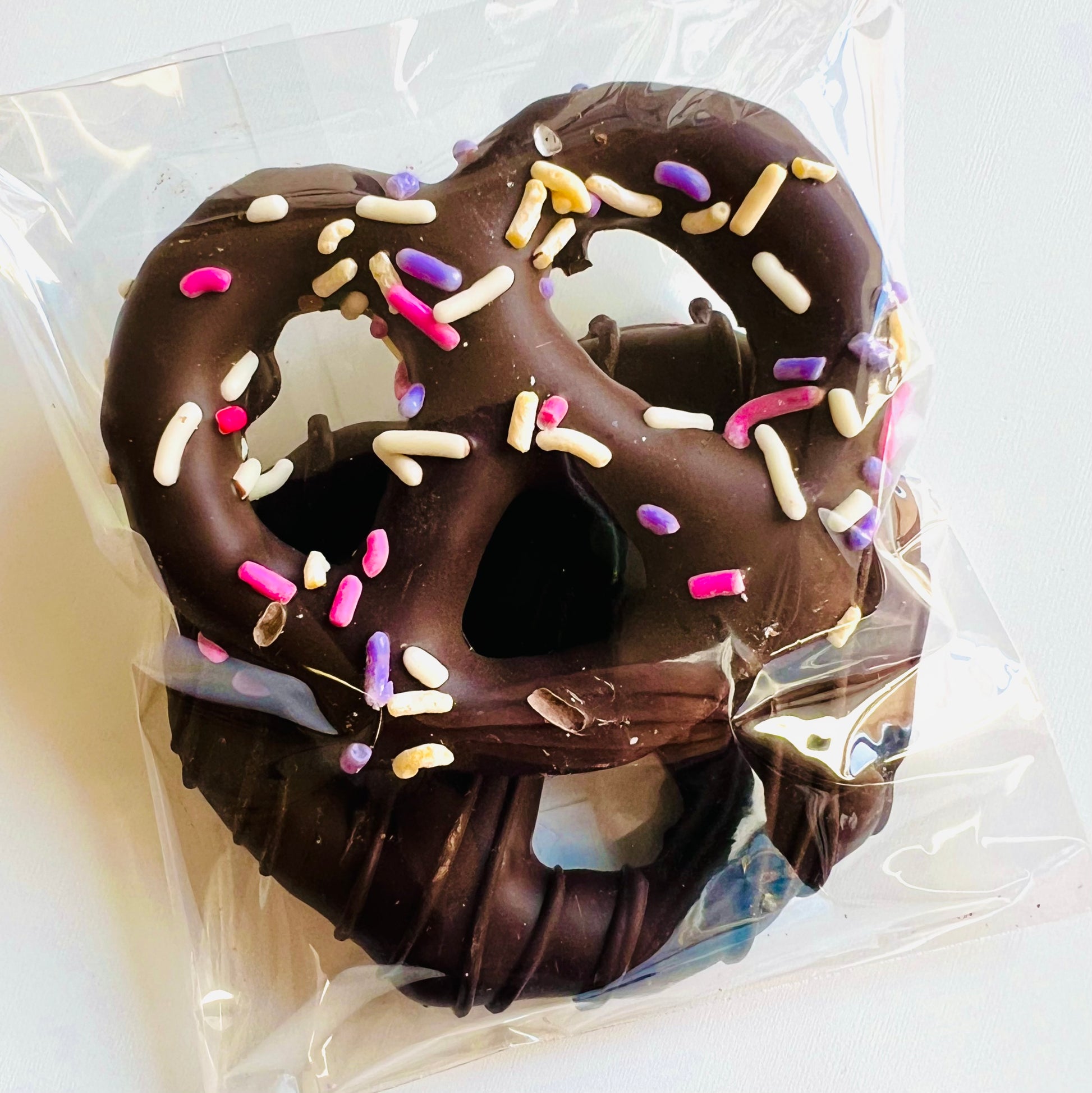 Indulge in the perfect blend of salty and sweet with our Dark Chocolate Pretzel Twists, beautifully decorated for the season. Each bag contains two delicious pretzel twists, generously coated in rich, smooth dark chocolate, and adorned with colorful sprinkles that capture the joy of spring. The sprinkles may vary, making each twist uniquely festive, but rest assured, every bite delivers a delightful crunch and a burst of flavor.