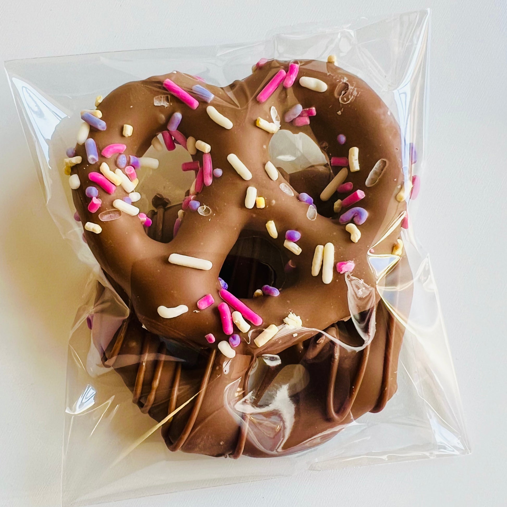 Two large pretzel twists covered in milk chocolate and topped with sprinkles.